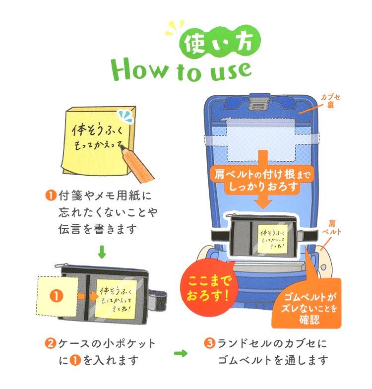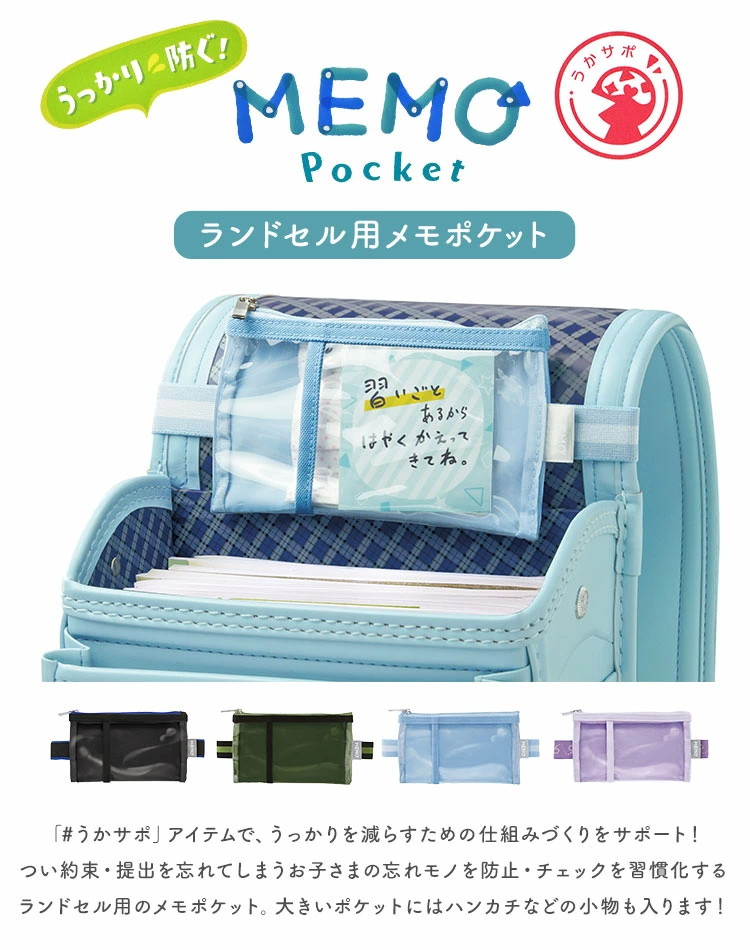 【メモポケット ランドセル用】ランドセル用メモポケットは、約束や提出物を忘れがちな子どもたちにぴったりのアイテムです!ランドセルのカブセに簡単に装着できるので、手間いらず。小ポケットと大ポケットがあり、メモだけでなく小物入れとしても活用できます。毎日の学校生活をもっとスムーズに、そして楽しくサポートしてくれる頼もしいアイテムです。