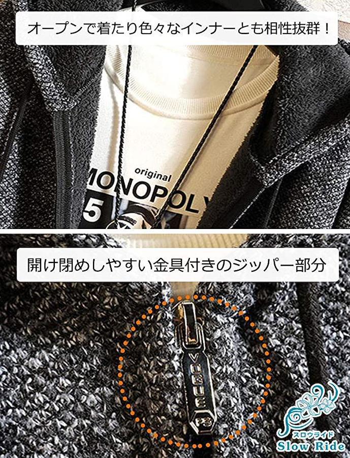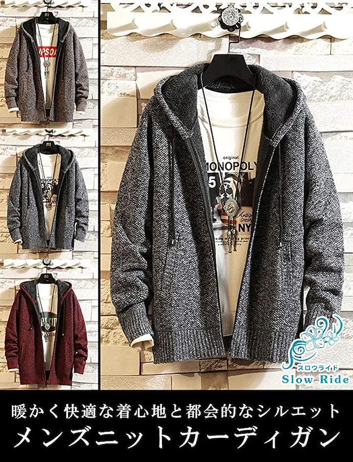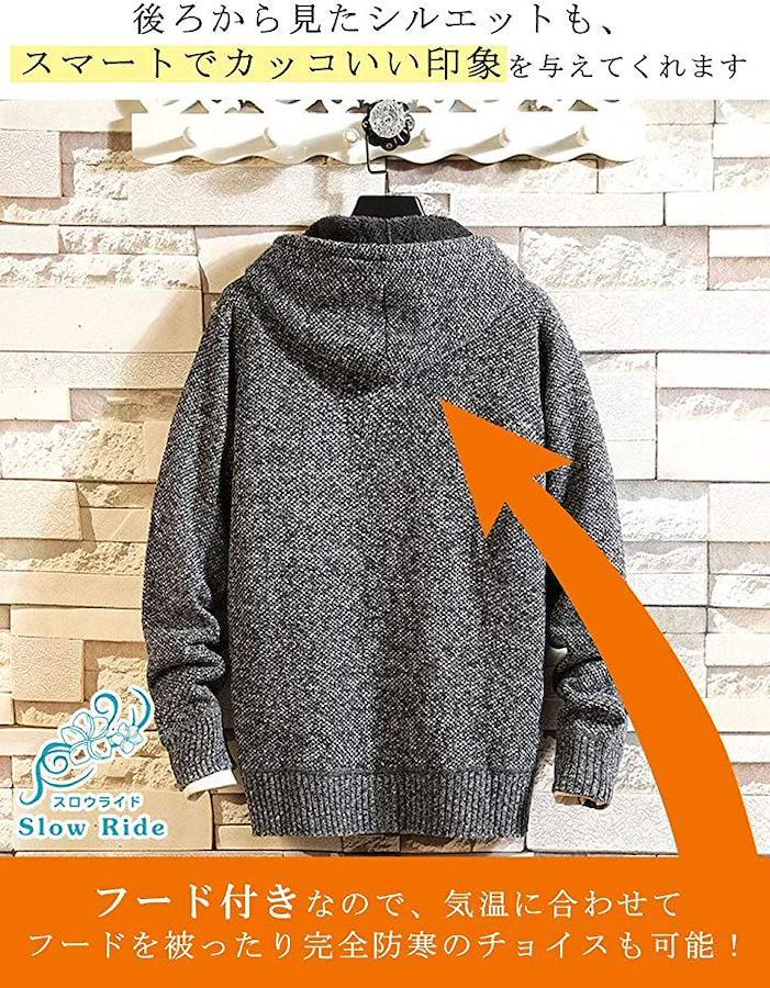 」暖かく快適な着心地と都会的なシルエットが、メンズファッションを一段と引き立たせてくれるニットカーディガンです*フード付き なので、気温に合わせて防寒のチョイスも可能。後ろから見たシルエットも、スマートでカッコいい印象を与えてくれます。