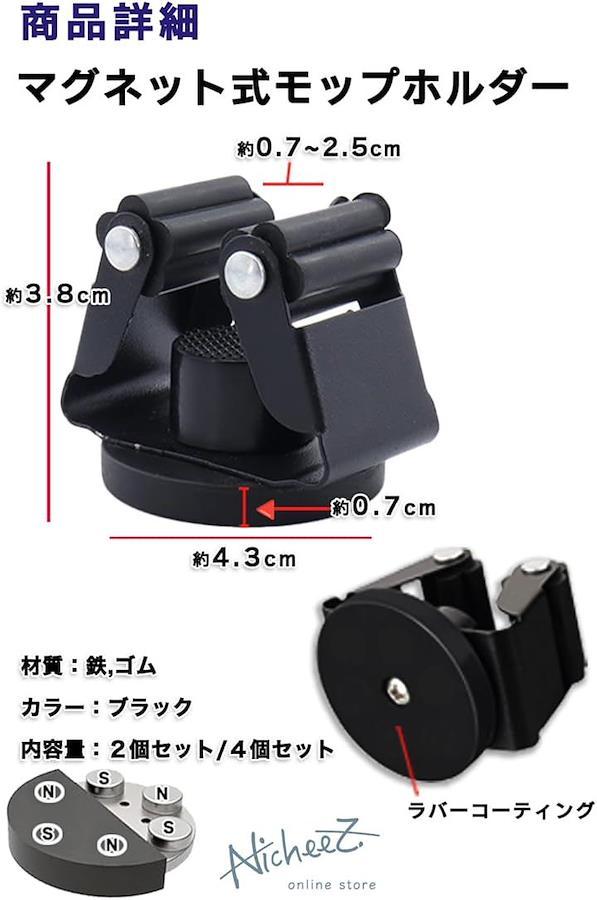 「商品内容」マグネット式モップ・ほうきホルダー(2個セット/4個セット) 材質:鉄&ゴム カラー:ブラック サイズ:直径/約4.3cm 奥行き/約3.8cm フック幅/約0.7cm~約2.5cm