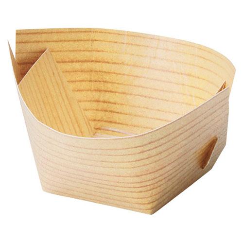 簡単に舟型に組み立てられる木目模様の紙を両面PPで挟んだ商品になります。PPになりますので水気がしみこみません。