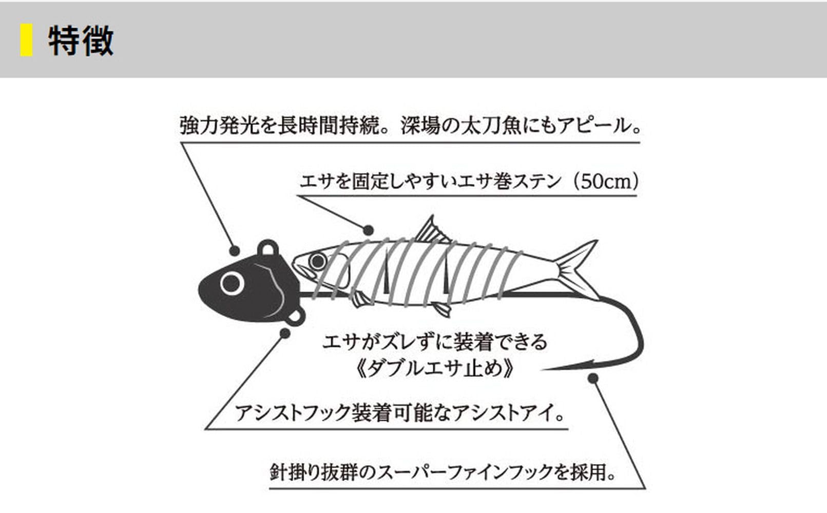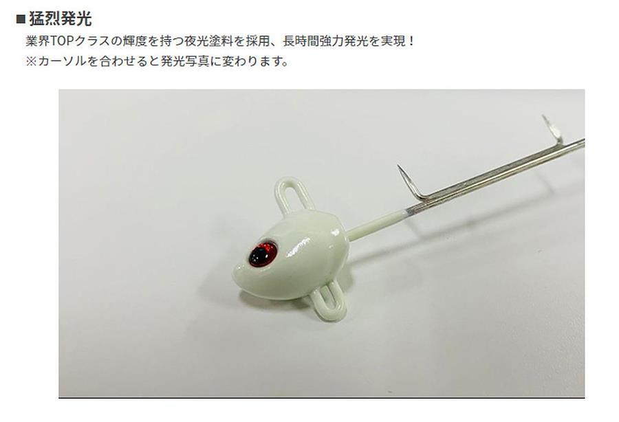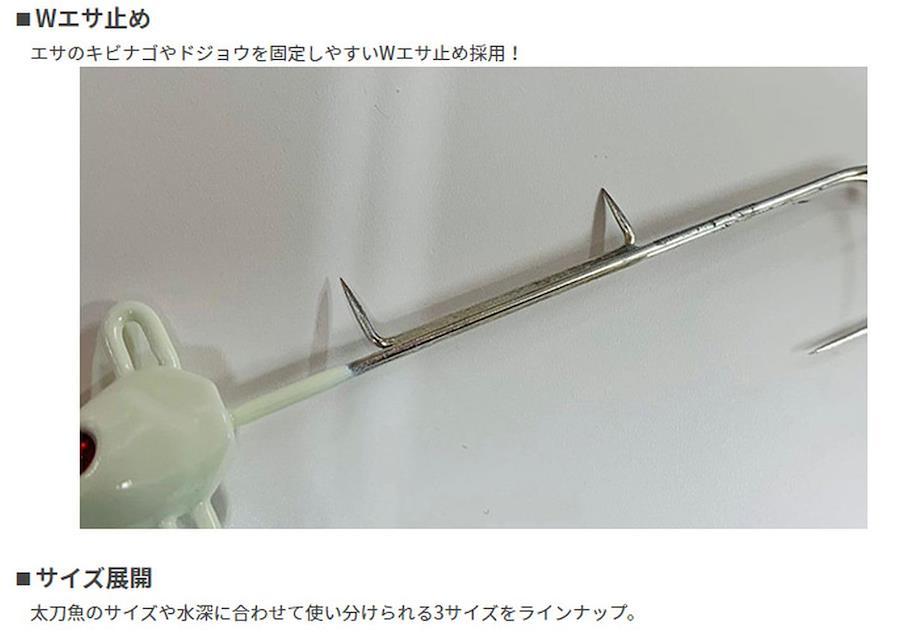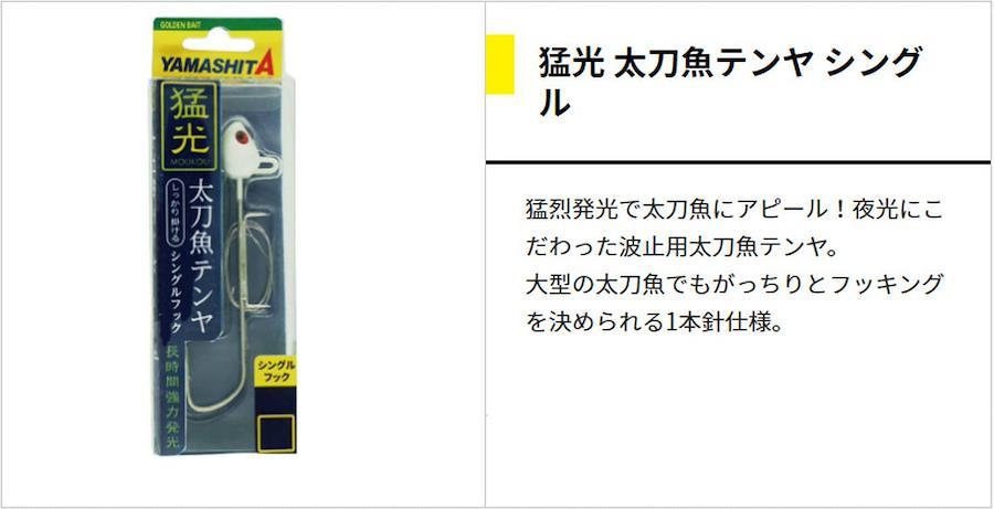 ヤマリア 猛光 太刀魚テンヤ シングル! ! 波止用テンヤベーシックモデルがリニューアル! 【猛光ヘッド】…長時間強力発光で夜釣りの太刀魚に強力アピール。【シングルフック】…大型の太刀魚でもがっちりとフッキングを決められる1本針仕様。【サイズバリエーション】…浅場から深場まで使い分けられる3サイズをラインナップ。