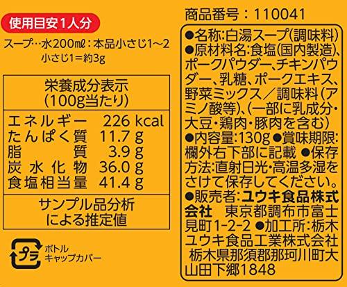 商品サイズ(高さ×奥行×幅):110×65×65mm原材料:食塩(国内製造)、ポークパウダー、チキンパウダー、乳糖、ポークエキス、野菜ミックス/調味料(アミノ酸等)、(一部に乳成分・大豆・鶏肉・豚肉を含む)内容量:130gブラント名:ユウキ食品こくのあるなめらかな味わいの白湯顆粒スープの素塩味の炒め物にもどうぞ【重要】メーカーによる商品リニューアルに伴いパッケージ(内容量も含む)変更が行われた場合、新パッケージでお届け致します事ご了承願います。