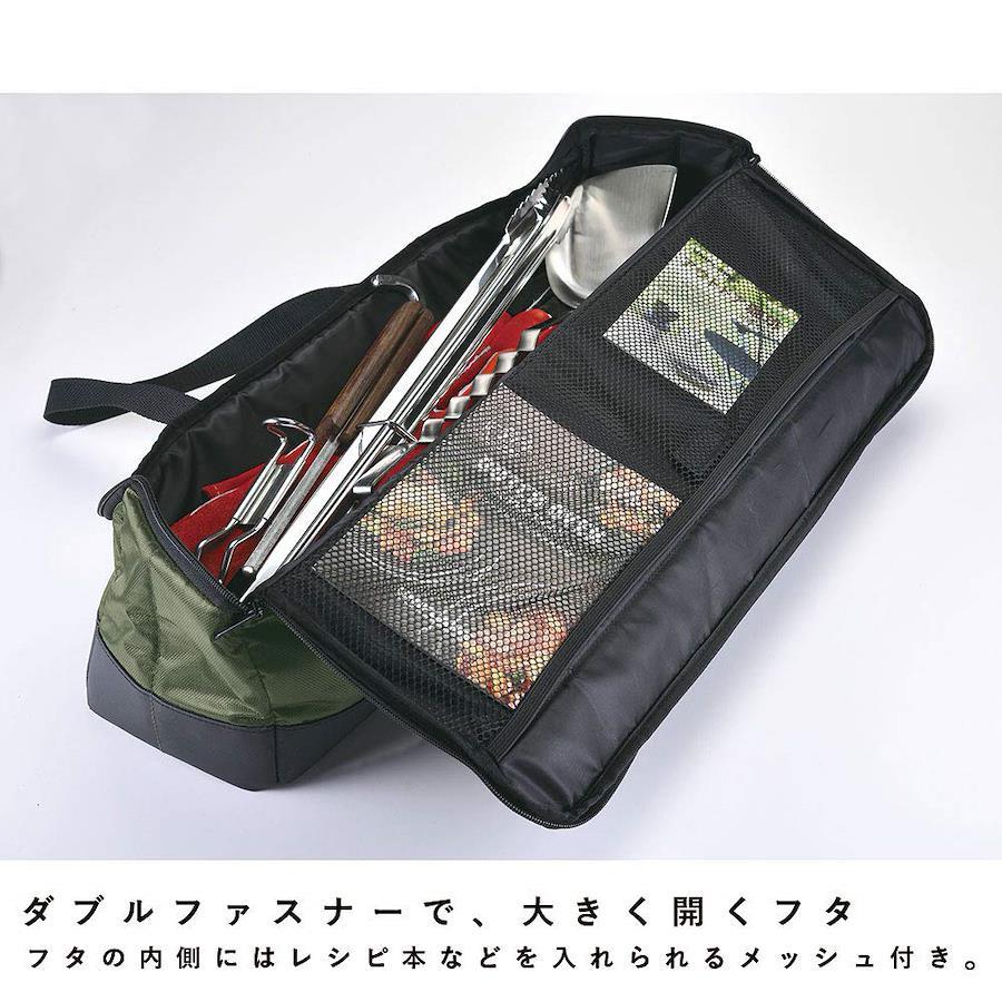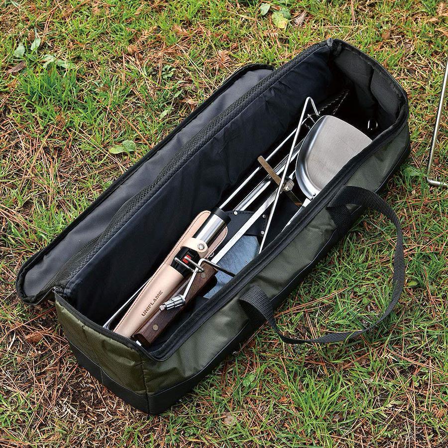 乱雑になりがちな焚き火周りのギアやバーベキュー小物などをスッキリ収納。大きく開くダブルファスナーのフタでたっぷり収納できます。底面は汚れに強いPVC加工。フタ裏には説明書などの小冊子や小物の収納に便利なメッシュポケット付き。