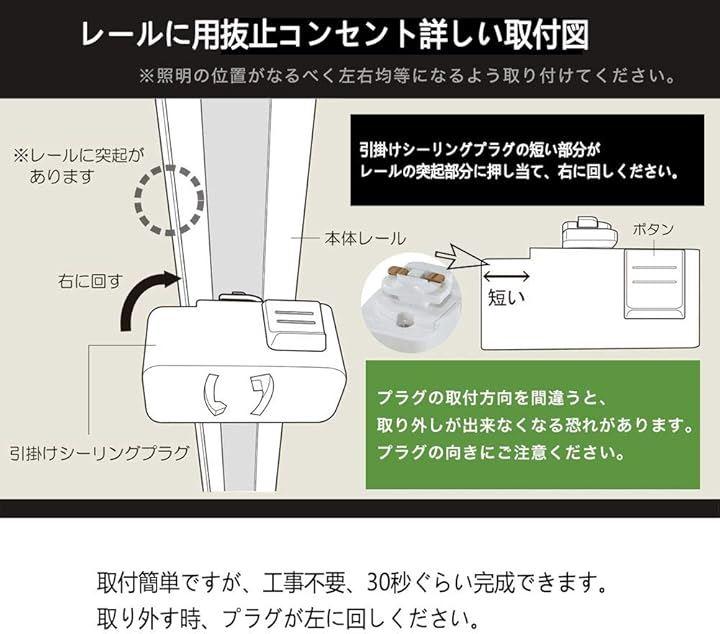 2.レールに突出側があります、レールに押し当てる時、引掛けシーリングプラグのボタン部分がレールに突出側の反対側に当て、右回り押してください。