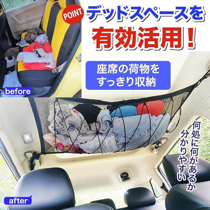 荷物をネットで固定することができ、お車のデッドスペースである天井部分を有効に活用することができます。