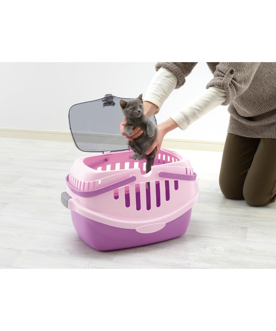 入り口が上についているので猫の出し入れしやすいキャリー。シートベルト固定機能付きでドライブにも最適です。