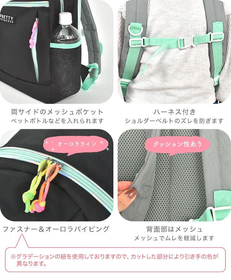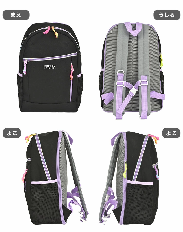 【拡張デイパック】ブラックにカラーのファスナーがおしゃれなプリティプリンセスのリュックサック。背面側のファスナーを開くと容量を拡張可能!学校やお出かけ先で荷物が増えた時も安心です◎A4が収納できるサイズで、PCスリーブ付きなので授業等で使う電子機器も安心して持ち運べます◎
