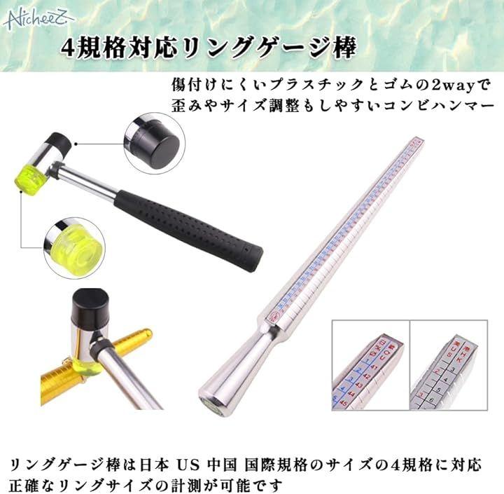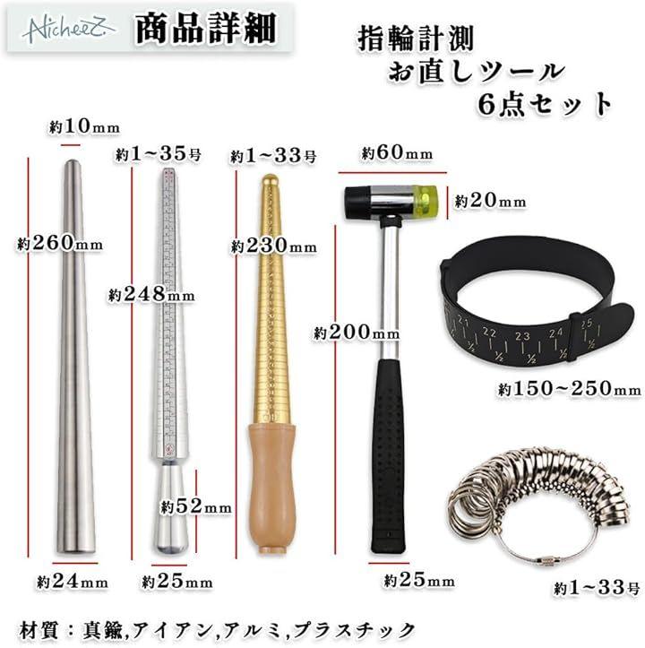 「商品内容」指輪計測・お直しツール6点セット 材質:真鍮/アイアン/アルミ/プラスチック サイズ棒長さ:約248mm 芯金棒長さ:約260mm ハンマーサイズ:長さ/約200mm 幅/約60mm リングゲージ計測:1-33号 ブレスレットゲージ計測:15-25cm