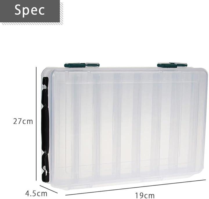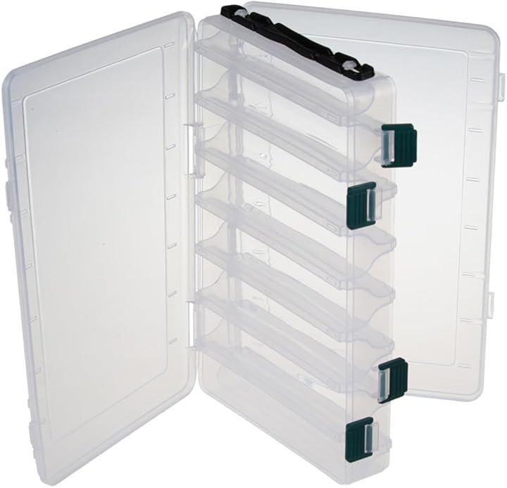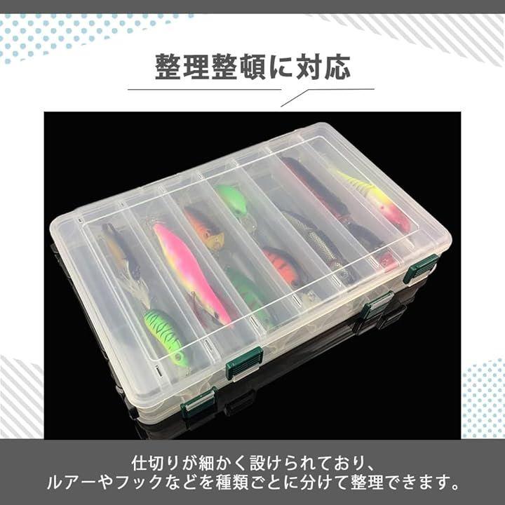 「両面仕様で収納力」 両面タックルボックスは仕切り付きで、多くの釣りルアーや小物を整理整頓できる構造になっています。