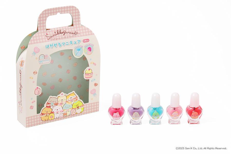 はがせるマニキュアの5本セット。カラフルなマニキュアで、指先のおしゃれを楽しんじゃお!マニキュアは水溶性で、除光液を使わず水で落とせます。落とす時は、水またはぬるま湯の中で、爪の根元や先からゆっくりはがしてください。 (C)2023 San-X Co., Ltd. All Rights Reserved.