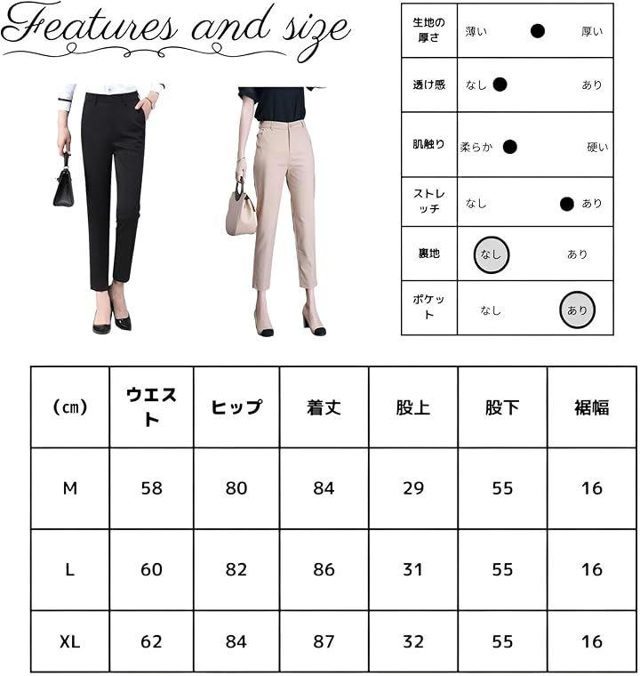 「素材」ポリエステル「カラー」ブラック/ベージュ「サイズ」M/L/XL M:ウエスト58cm/ヒップ80cm/着丈84cm/股上29cm/股下55cm/裾幅16cm L:ウエスト60cm/ヒップ82cm/着丈86cm/股上31cm/股下55cm/裾幅16cm XL:ウエスト62cm/ヒップ82cm/着丈87cm/股上32cm/股下55cm/裾幅16cm 詳細は写真をご覧ください