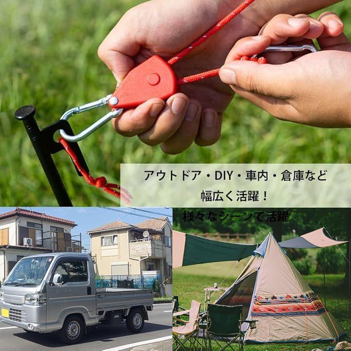 商品仕様 ・内容:ロープラチェットx4個 ・ロープ長:約4m ・ロープ径:約4mm ・耐荷重:約68kg ・カラー:カーキ/グリーン/オレンジ/ブラック/レッド キャンプやバーベキュー、フェス、ピクニック、車中泊、DIYなどあらゆるシーンで役立つ万能ギア。
