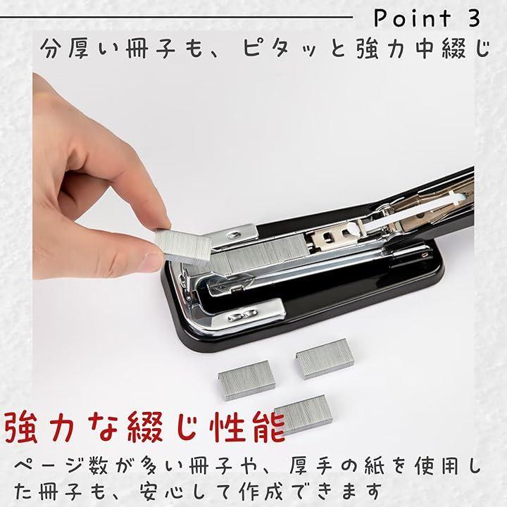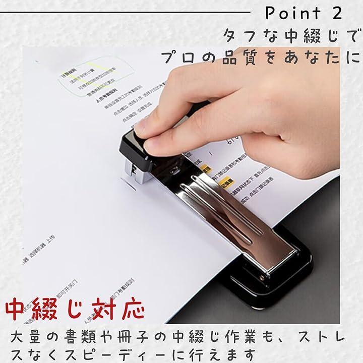 「強力な綴じ性能」強力なホッチキスは少ない力でしっかりと綴じることができ、何枚も重ねて綴じる作業をスピーディにこなすことができるため、業務やオフィス環境での作業効率が大幅に向上します。