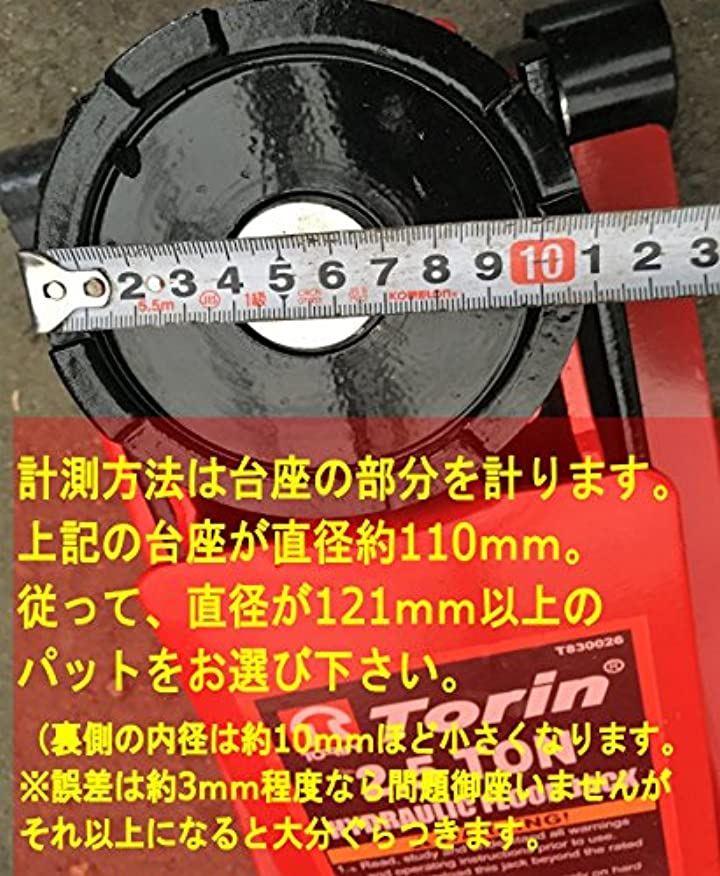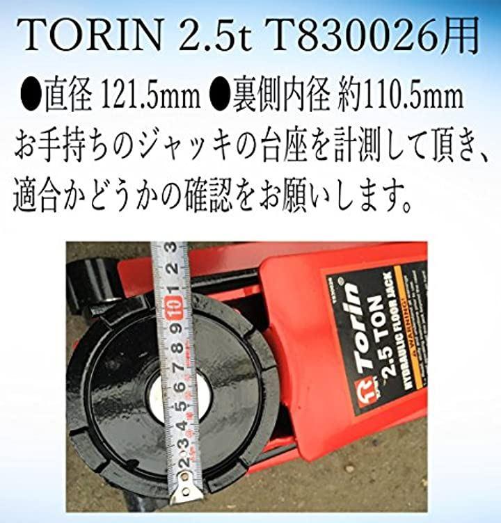 *個数:1個 *材質 :ラバー *直径 : 121.5mm * 高さ: 25mm *裏側内径 : 約110.5mm*溝深さ:15mmミリ 溝幅:8mm TORIN(トリン)T830026 (2.5tジャッキ)に対応するジャッキパットになりますが、その他のジャッキにも対応する場合が御座います。