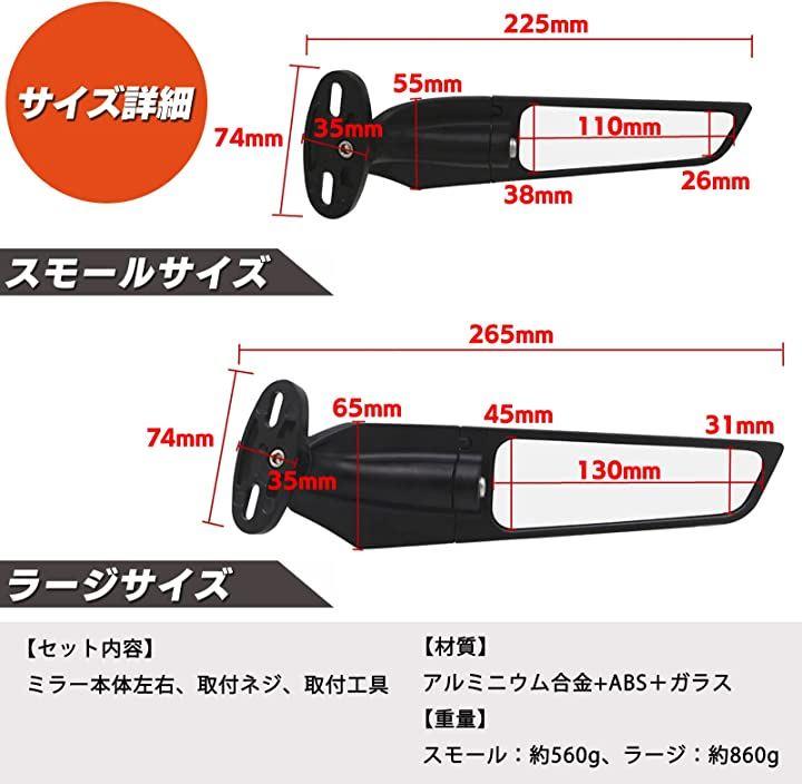・「セット内容」ミラー本体左右、取付ネジ、取付工具 「カラー」ブラック 「材質」アルミニウム合金+ABS+ガラス 「重量」スモール:約560g、ラージ:約860g