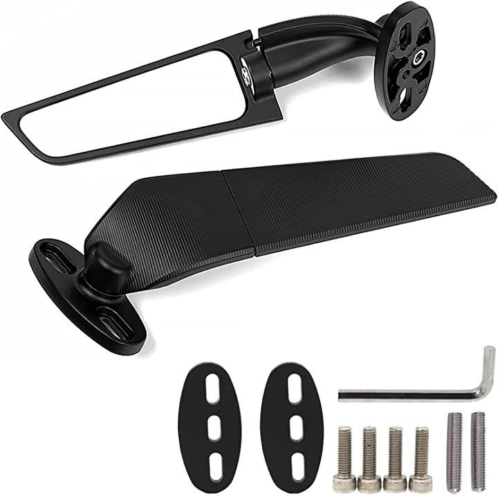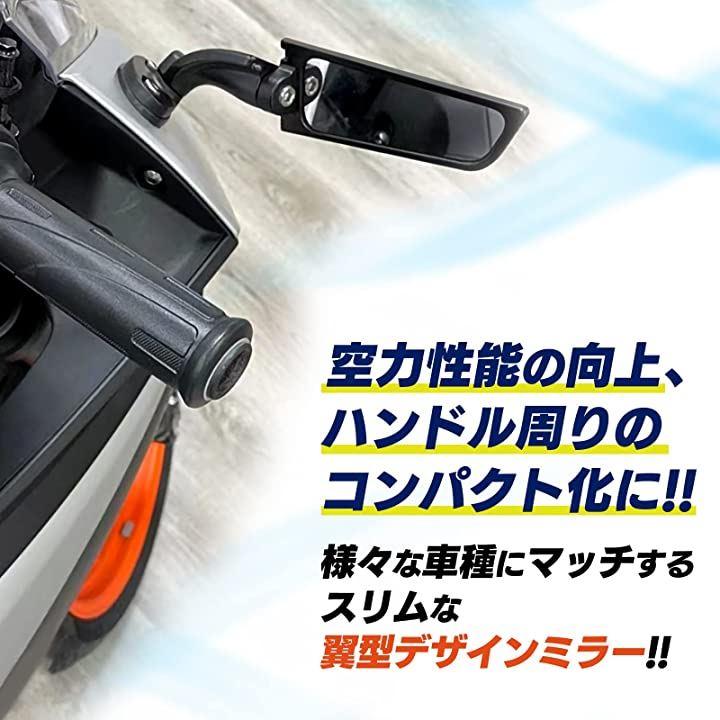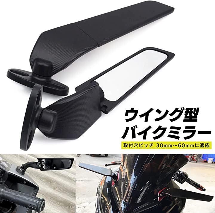 空力性能を追求したスタイリッシュなデザインの汎用タイプのウイング型バイクミラー。