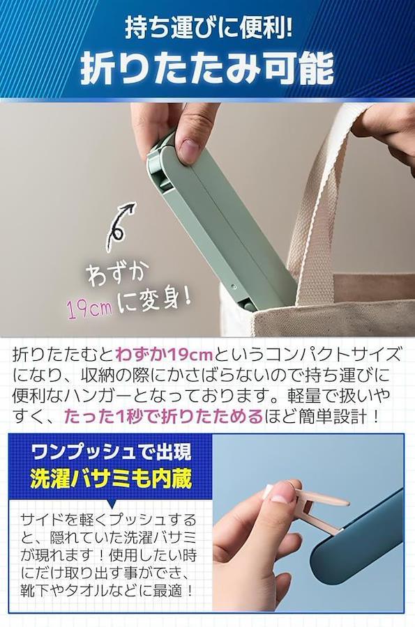 「折りたたみ可能」折りたたむとわずか19cmというコンパクトサイズになり、収納の際にかさばらないので持ち運びに便利なハンガーとなっております。
