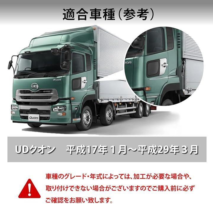 「適合車種(参考)」 ・日産 UDクオン(平成17年1月~平成29年3月) *サイズが合えばUDパーフェクトクオン(平成29年4月~)、UDフレンズコンドル(平成22年11月~平成29年7月)にも取付可能 *車種のグレード・年式によっては、加工が必要な場合や、取り付け出来ない場合がございますのでご購入前に必ずご確認をお願い致します。