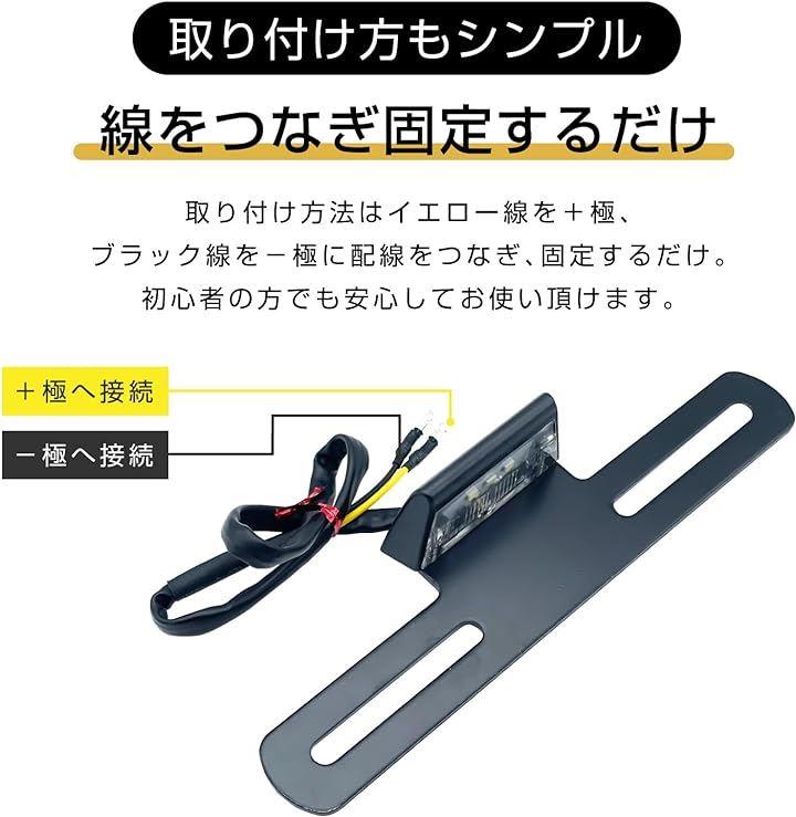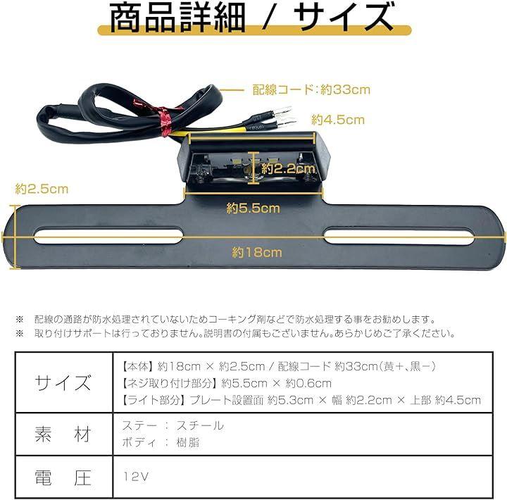 「サイズ」 本体 約18cm x 約2.5cm / 配線コード 約33cm(黄+、黒−) / ネジ取り付け部分 約5.5cm x 約0.6cm / ライト部分 プレート設置面 約5.3cm x 幅 約2.2cm x 上部 約4.5cm 「電圧」 12V 「素材」 ステー:スチール / ボディ:樹脂