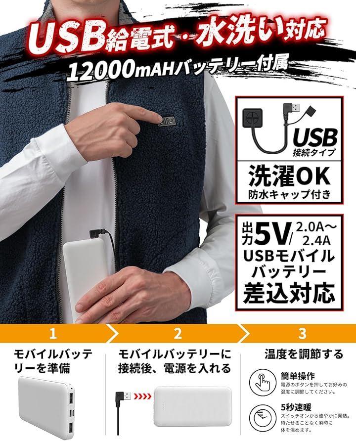 「USB給電・専用バッテリー不要」ヒーターベストはUSB駆動対応で、手持ちのモバイルバッテリーでも使用いただけます。