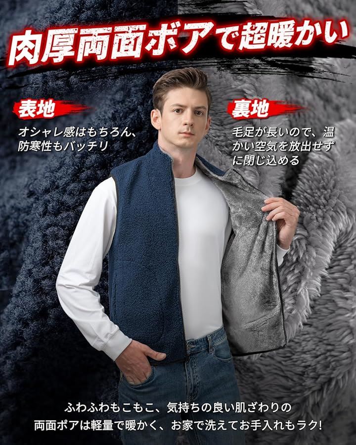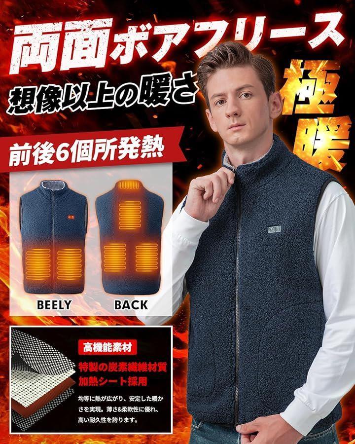 「着心地抜群・強力速暖」ふわっと安心感のボアフリースを全体に使用しましたヒーターベスト。