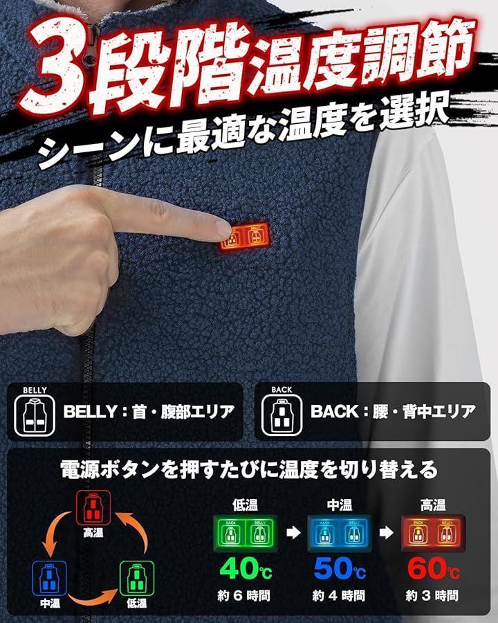 「前後独立・3段階温度調節」首元・背中・お腹・腰の部分に6つの加熱ヒーターを内蔵されており、前後で分別して温度調整ができるヒートベスト。