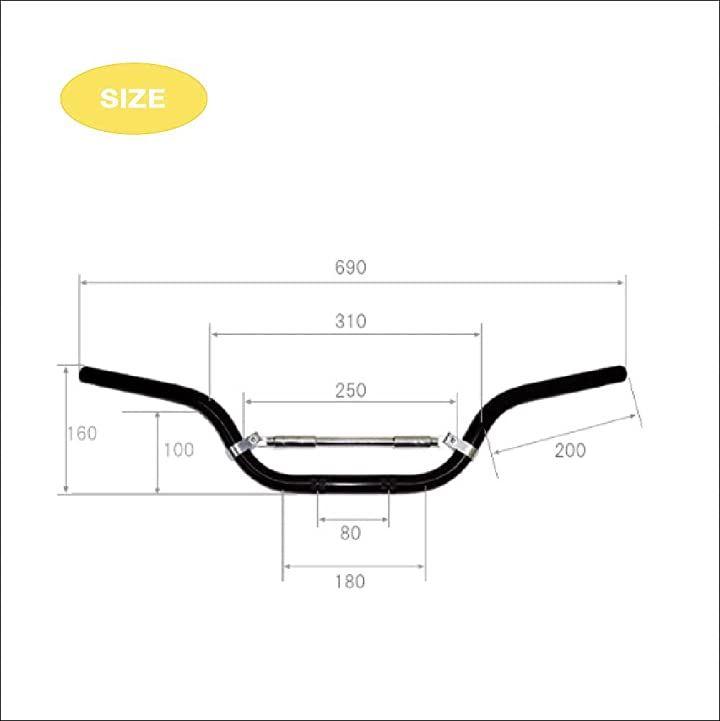 「サイズ」全長:690mm全高:160mm引き:100mmグリップ幅:100mmパイプ径:22.2mm質量:470g22.2mmのハンドルを使用している車種であればオン・オフ問わず装着可能ですが、車種によっては取り付けの場合ワイヤー類の長さが足りない場合がございます。
