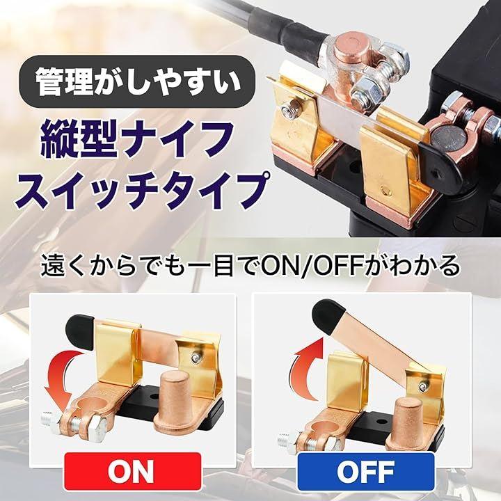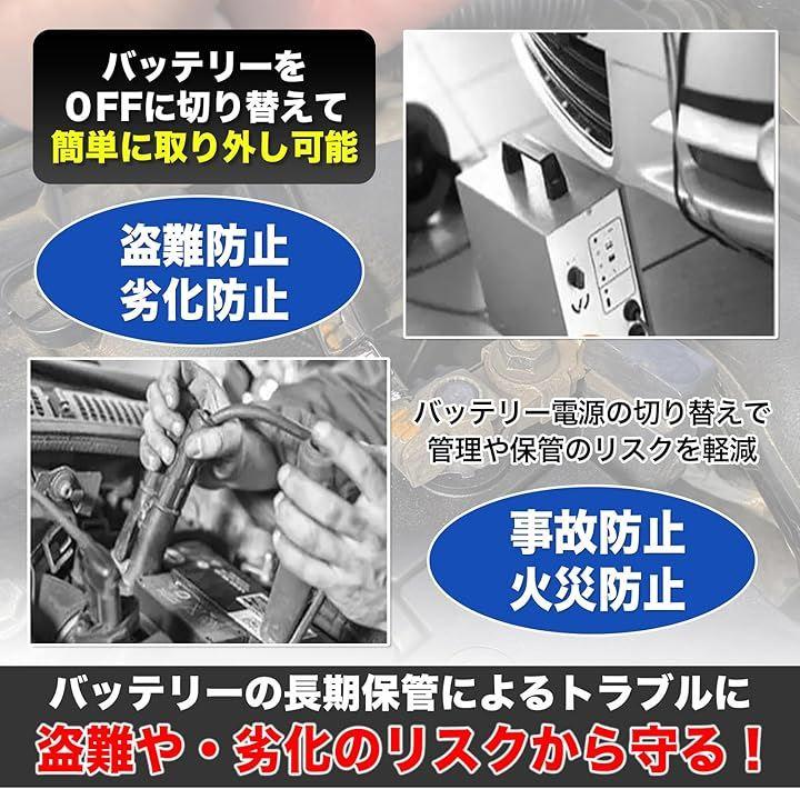 カーメンテナンス時のショート防止、長期間不使用車のバッテリー消耗防止、ボートや自動車、オートバイや旧車、キャンピングカー等のバッテリー搭載車の電源遮断に役立ちます。