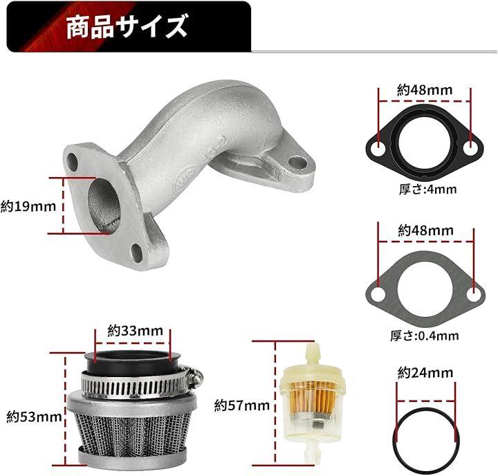 「充実の付属品セット」キャブレター本体x1に加え、燃料フィルターx1、ガスケットセットx1、インマニ(マニホールド)x1、エアクリーナーx1を同梱。