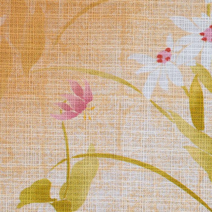 全体にあしらわれた「山野草」は着物の友禅染のような繊細さ。細やかな表現を得意とするデジタルプリントで染めました。箔模様の金屏風に描かれているかのように、サクラソウ、カタクリ、ミヤマヨメナ、キキョウなど山野に咲く可愛い花々が、暖かな橙色の陽射しの中で咲き競います。お部屋を上品に、ひときわ華やかに飾ってくれることと思います。生地は異なる太さの糸を使い平織りとなな子織りを組み合わせて織られたブッチャー生地で、格子のような織り模様があり、しっかり柔らかな手触りが心地よく織り糸の表情が感じられる素材です。裏側は金茶の無地で作りました。【カバーサイズ】 横65㎝×縦69㎝【生地素材】 綿(ブッチャー)100%この商品はカバー(ファスナー加工)のみです。中わたは別途ご購入ください。またカートの購入可能数より多い数をご希望の場合はご相談ください。