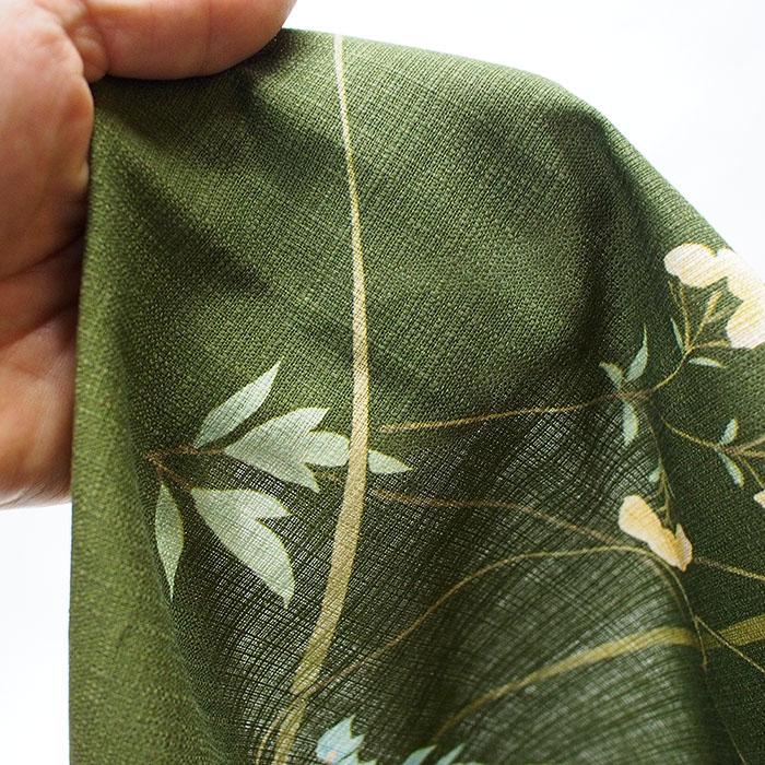 全体にあしらわれた「藤と秋草」は着物の友禅染のような繊細さ。細やかな表現を得意とするデジタルプリントで染めました。地色の深い緑に陽だまりが出来たようなボカシに、草花がより柔らかく映えます。お部屋を上品に、ひときわシックに飾ってくれることと思います。生地は異なる太さの糸を使い平織りとなな子織りを組み合わせて織られたブッチャー生地で、格子のような織り模様があり、しっかり柔らかな手触りが心地よく織り糸の表情が感じられる素材です。裏側は利休の無地で作りました。【カバーサイズ】 横59㎝×縦63㎝【生地素材】 綿(ブッチャー)100%この商品はカバー(ファスナー加工)のみです。中わたは別途ご購入ください。またカートの購入可能数より多い数をご希望の場合はご相談ください。