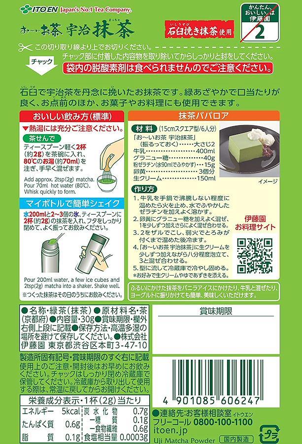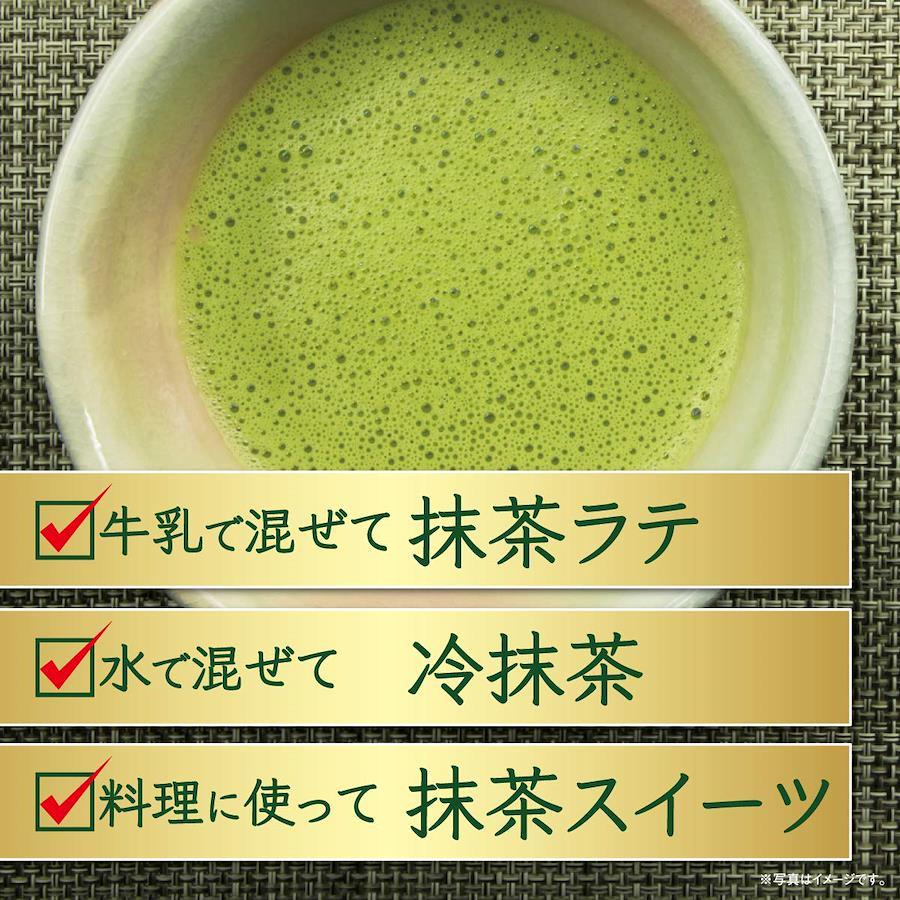 ●京都府産の宇治茶(てん茶)を石臼で挽いて仕上げた本格的抹茶です。●緑鮮やかで口当たりが良く、お点前はもちろんお料理にも最適です。●使いやすい、チャック付スタンド袋で便利。●パッケージ裏面でお料理レシピをご紹介しています。牛乳と混ぜたり、ヨーグルトに振りかけても簡単に、美味しくいただけます。●粉末茶は、お茶の葉を丸ごと粉末にすることでお茶の栄養を100%摂取でき、健康を気にする方にもおすすめです。