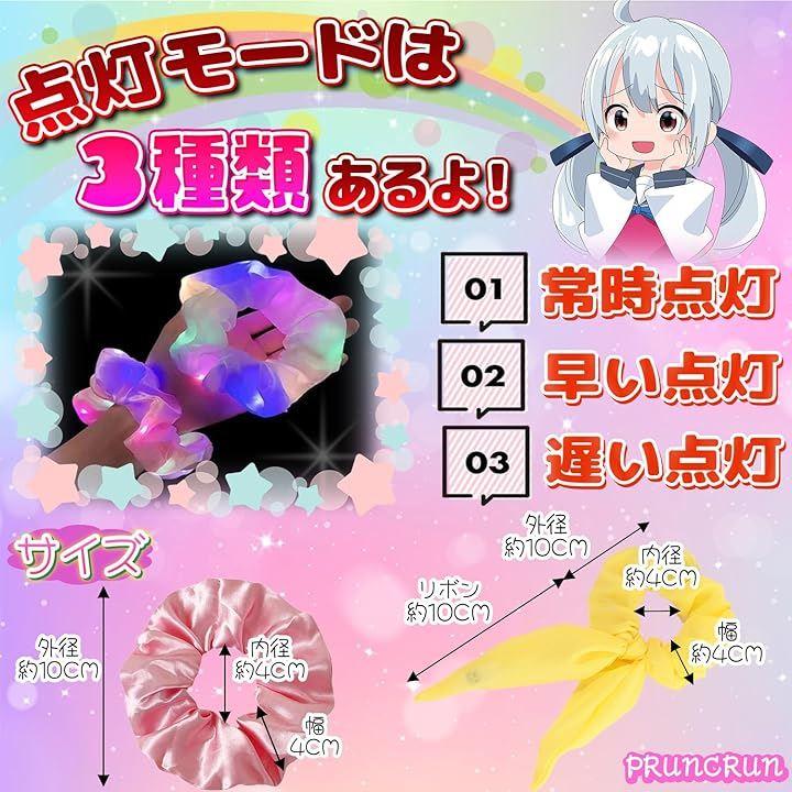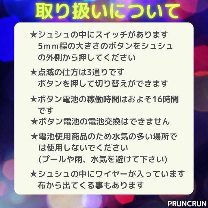 ボタン電池内蔵の光るシュシュ「注意」シュシュの中にボタン電池があります ボタンを押す事で点灯する商品です 電池交換はシュシュの生地を切る必要がありおすすめしません 電池使用商品です水気の多い場所では使用しないでください シュシュの中に針金を使用しています 針金が生地から出る恐れもあります 取り扱いにお気をつけください