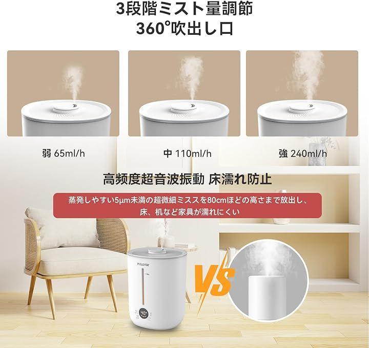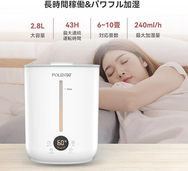 最大加湿量は240ml/h、2.8Lの大容量タンクと組み合わせることで、最大出力時で約12時間、最小出力時には最大43時間連続で運転可能です。