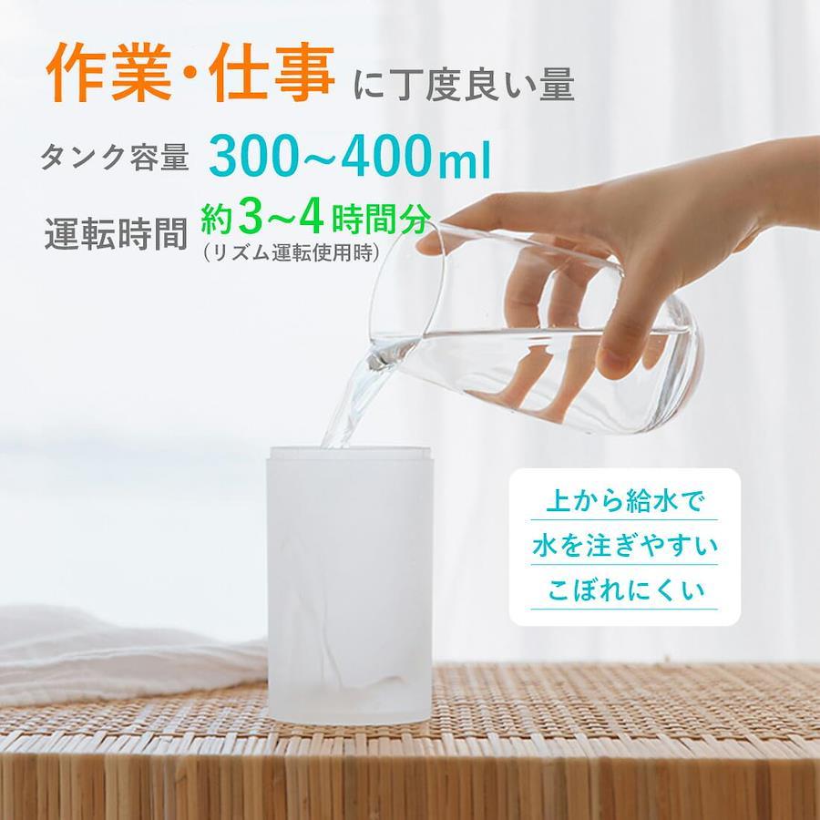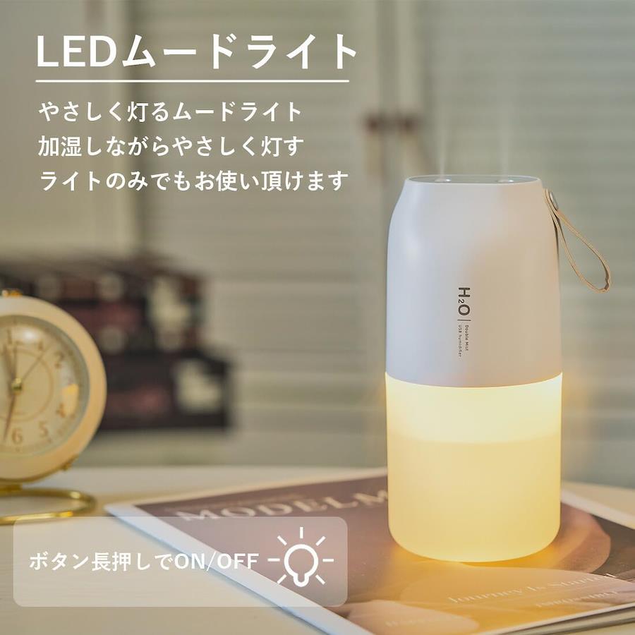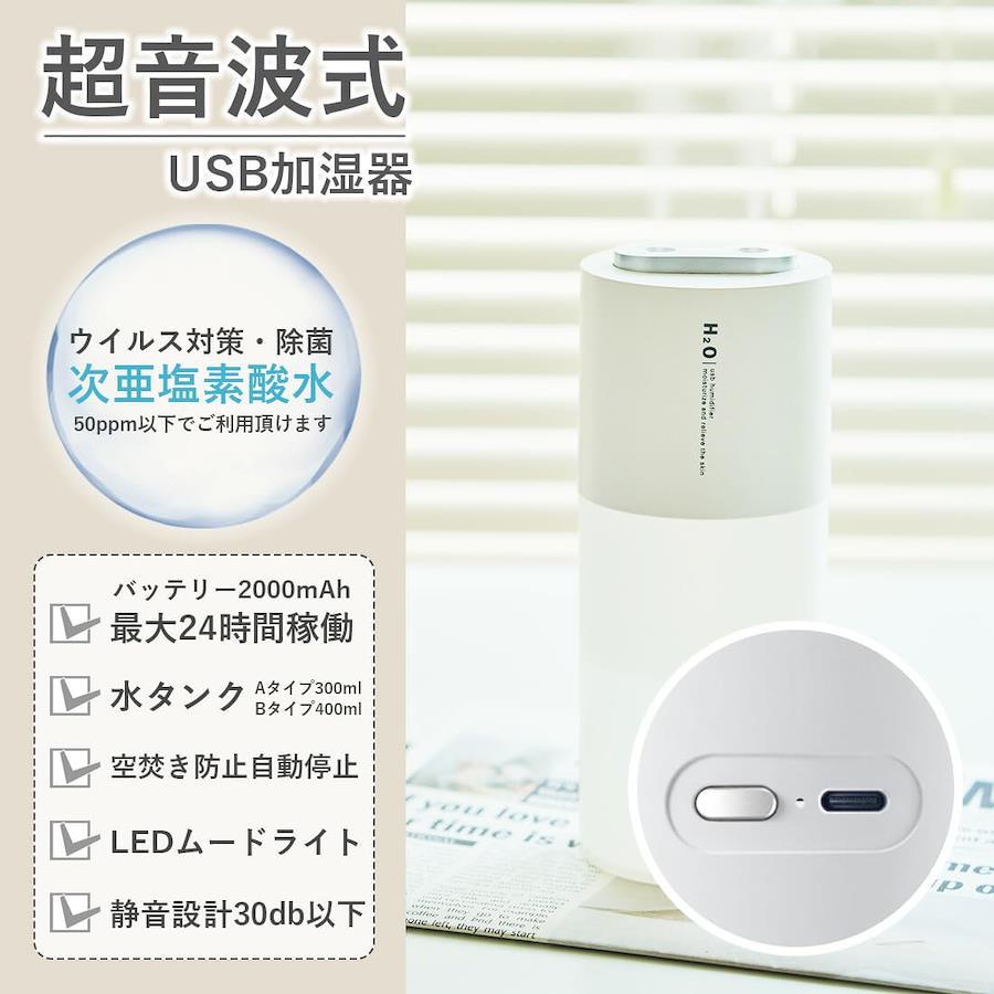 3営業日以内に発送≪新品未開封品≫:セット内容:加湿器×1、吸水芯×2、USBケーブル×1カラー:2カラーサイズ:高さ18.5×横幅7.5×奥行7.5(cm) 重量240g仕様:ダブルノズル、ワンボタン設計(操作簡単)、超音波式、充電式、バッテリー容量2000mAh、タンク容量Aタイプ300、Bタイプ400ml機能:2パターンの噴射、LEDムードライト、自動停止(空焚き防止)