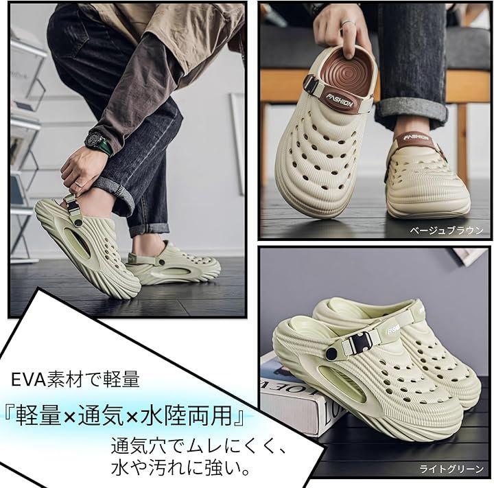 「軽量EVA素材&通気設計」 軽量かつ柔軟なEVA素材を使用し、サンダル全体の負担を軽減。