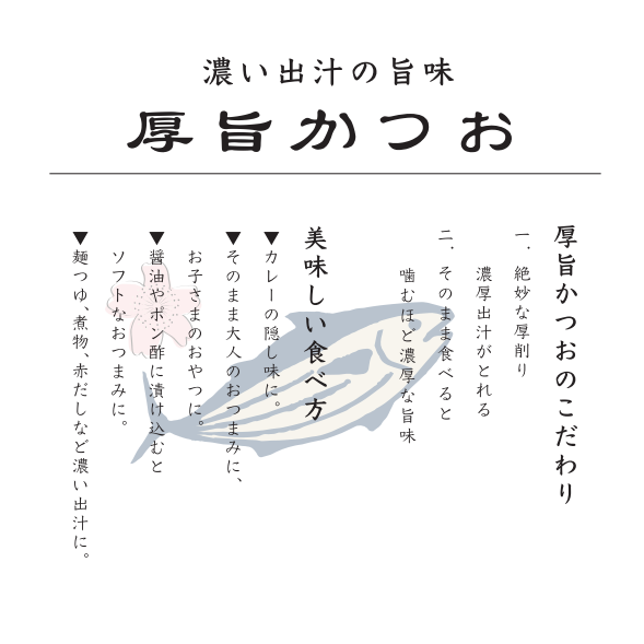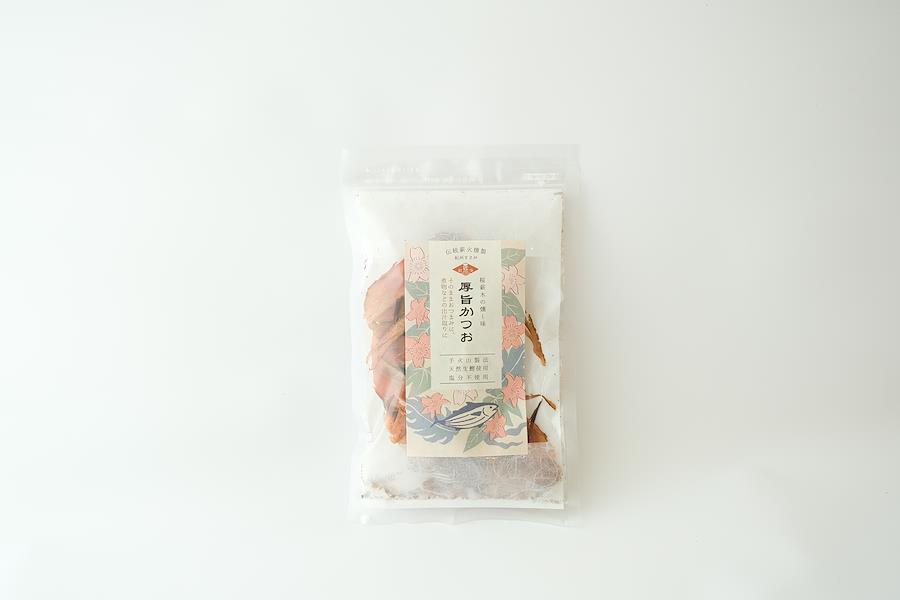 "水揚げ直後の天然生鰹を使用しているため塩味が少なく、長時間の煮出しに耐えるように厚く削ったものです。香り高く、すっきりとした上品なだしが取れるのが特徴です。コクと風味が豊かな濃くて「強い」かつおダシがとれます。また、そのまま食べると噛むほど濃厚な旨味を感じられ、大人のおつまみやお子様のおやつにも最適です。和歌山県に伝わる「手火山製法」。約30日間燻しと寝かしを繰り返し旨味を熟成させた極上の風味を引き出す秘伝の技を、日本の職人が現地スタッフに指導して製造しております。削り工程を和歌山県すさみ町にて行う事で、燻しが香る削りたてを実現しております。