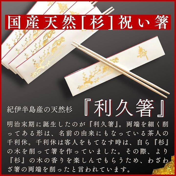 国産杉の利久箸に金箔の「寿」を施し、お祝いの膳に彩りを添えます。