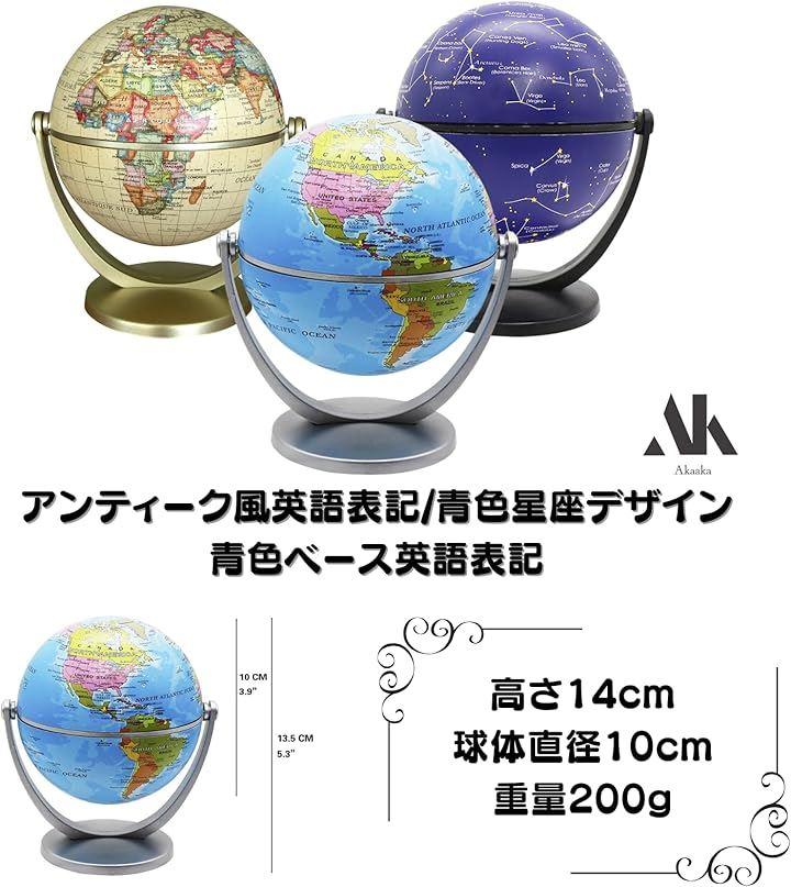 「商品スペック」高さ14cm、球体直径10cm、重量200g、素材:プラスチッ、バリエーション:アンティーク風英語表記、青色ベース英語表記、青色星座デザイン