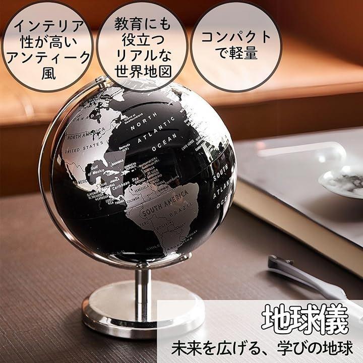 「インテリア性が高いアンティーク風地球儀」シルバーの落ち着いた色合いとアンティーク調のデザインが、部屋の雰囲気を格上げする。