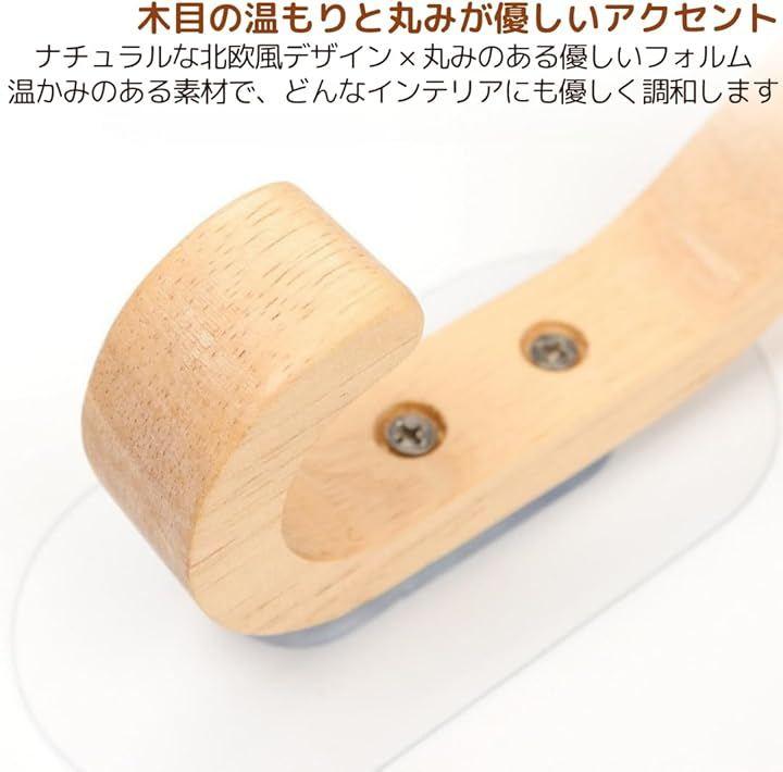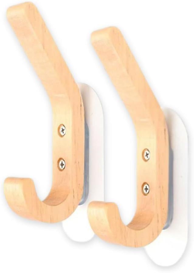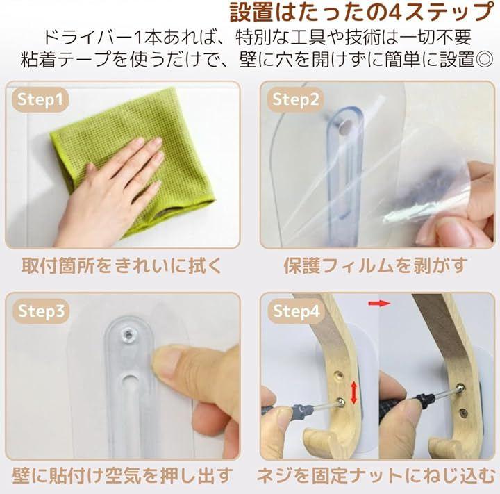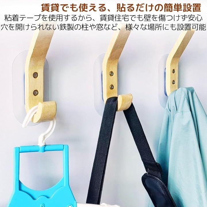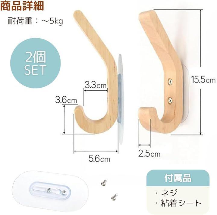 「賃貸でも使える、貼るだけの簡単設置」ナチュラルな雰囲気の木製壁掛けフックの2個セットです。