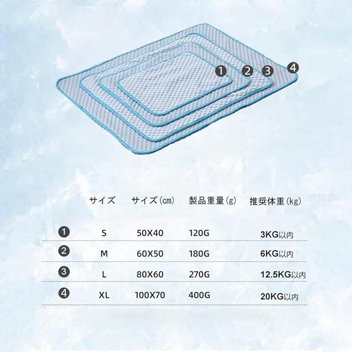 ペットの体格に合わせてお選びください: Sサイズ(50x40cm):体重3kgまでの小型犬・子猫に最適 Mサイズ(60x50cm):体重6kgまでの猫・小型犬におすすめ Lサイズ(80x60cm):体重12.5kgまでの中型犬に対応 XLサイズ(100x70cm):体重20kgまでの中~大型犬に対応可能 暑さが厳しい夏でも、ペットが快適に過ごせるように。