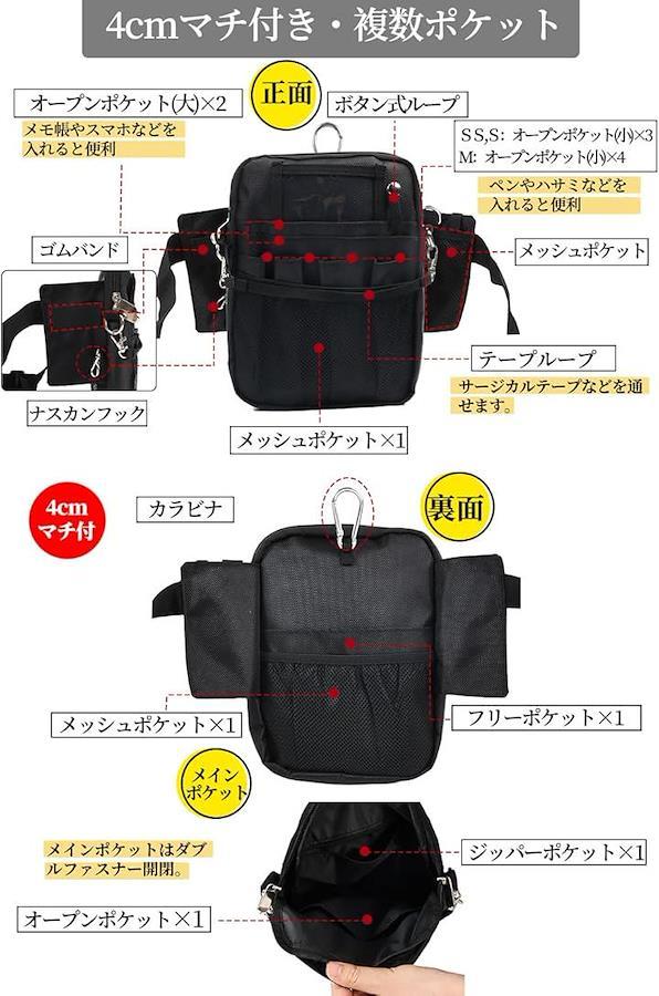 *「大小複数ポケットで仕分け」メモ帳、スマホ、A6・B6ノートなどが入る大きめのポケット、貴重品や鍵が入れられる内部ファスナー付きポケット、ペンやハサミなどが入る細長いポケット、小物収納にぴったりのメッシュポケットなど、大小のポケットの組み合わせで使いやすさ抜群。ナースオーガナイザー・ワークポーチとしても便利。