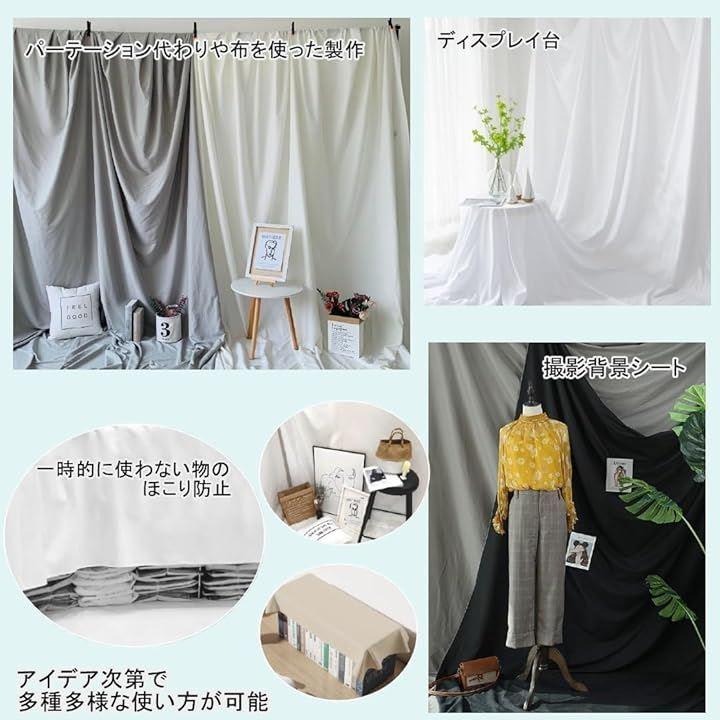 人物、物撮り撮影の背景シートとしてや、上から吊ってちょっとしたパーテーション代わり、布を使った製作、店舗でのディスプレイ台やテーブルの上に敷いていただく等、アイデア次第で多種多様な使い方ができます。