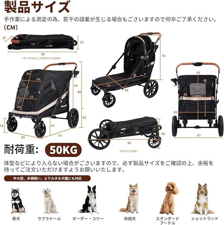 「商品仕様」大型犬 カート展開サイズ(約):長83cm x 前幅50cm/後幅67cm x 高さ98cm 収納サイズ(約):長さ95cmx幅67cmx高さ30cm(折りたたみ方法(2)で僅か13cm) 本体フレーム:合金鋼 生地:600D防水オックスフォード布 車輪直径:前輪18cm、後輪28cm 車輪素材:EVA+PU 本体重量(約):9.3KG 耐荷重(約)50KG 中大型・多頭飼い・老犬介護向け 合金鋼スチール製フレームと丈夫な生地で作られた一品です。