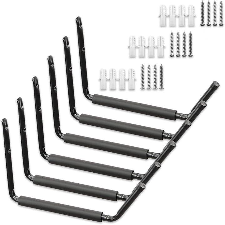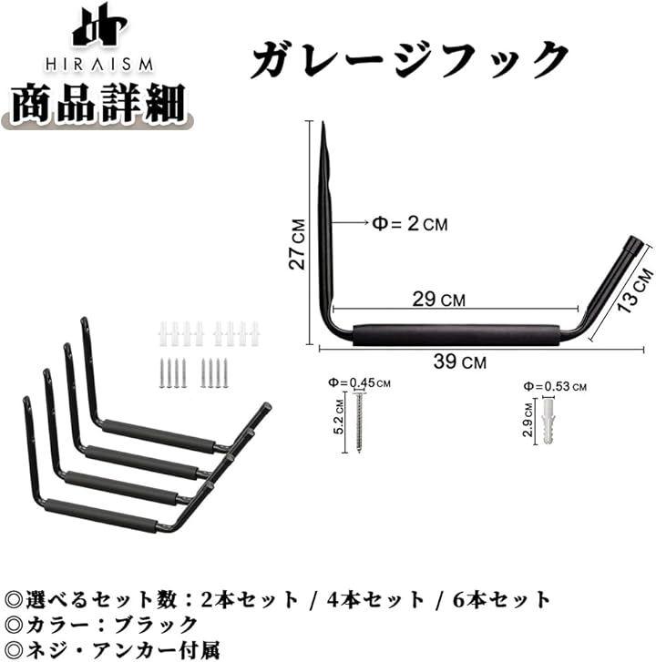 「商品内容」ガレージフック:6個セット カラー:ブラック サイズ:高さ27cm アーム長さ29cm アーム立ち上がり13cm セット内容:アームx6本 ネジ:12本 アンカー:12個 適用アイテム:サーフボード、スノーボード、カヤック、ロードバイク、カヌー、スキーボード、SUPボード、脚立、はしご、建築資材、材木等、様々な大型アイテムに。