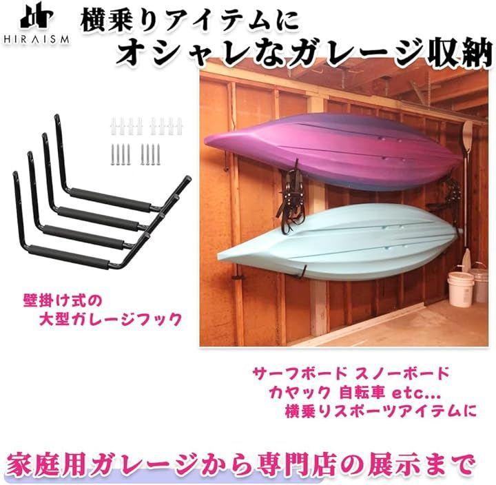 「横乗りアイテムのおしゃれ収納に」サーフボード、スノーボード、カヤック、自転車など、横乗りスポーツアイテムをスマートかつおしゃれに収納できる「大型ガレージフック」です。