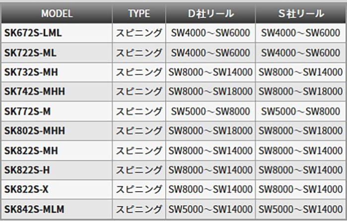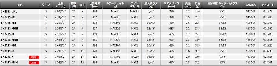 全長: 2.49m (8.2ft) / 継数: 2本(グリップジョイント) / 仕舞: 178cm / 先径: 2.9mm / リアグリップ: 495mm / 自重: 389gタイプ: スピニングリール(S) / パワー: X / 調子: レギュラーファースト (RF)適合ルアーウェイト: MAX 200g (下限60~70g、推奨 180g前後のプラグ) / 適合PEライン: MAX 10号 / 最大ドラグ設定: 16kg(60°)製法:「バットブランク カーボンナノチューブ素材 C・N・T」「Kガイド(ステンレスフレーム・SiC-Sリング)/オーシャンガイド(ステンレスフレーム・SiC-Sリング)配置」「天龍×西陣織」「日本製」モデル【SK822S-X (近海オールラウンド・ストロングモデル)】……青物全般からマグロ等のゲームに対応し、オーバヘッドキャストによる遠投を得意としたモデル。レギュラーファースト調子で、60~70gを下限に180g前後のプラグを扱い易いパワー設定。大型ヒラマサや、50kg程のマグロ類の狙いに活躍するストロングロッド!!
