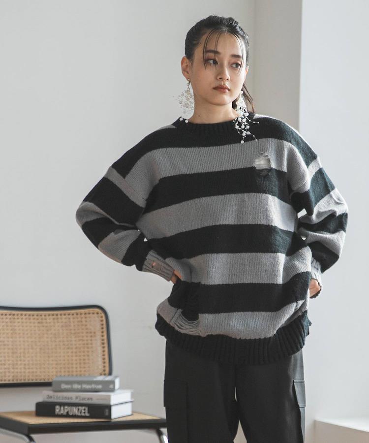 ダメージ×太ボーダーの最先端ニットオーバーサイズシルエットで幅広い着こなしを