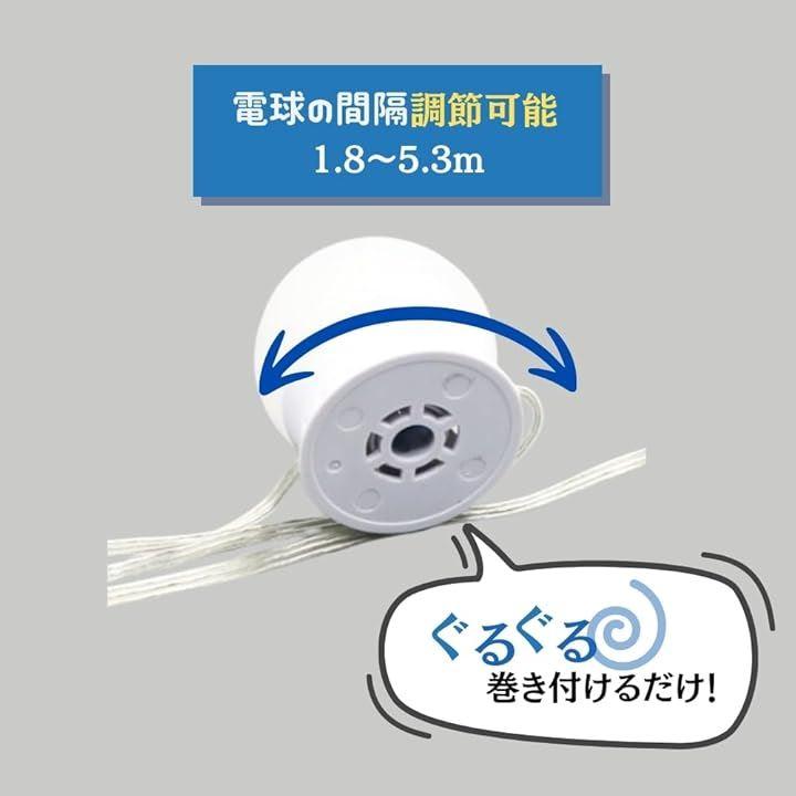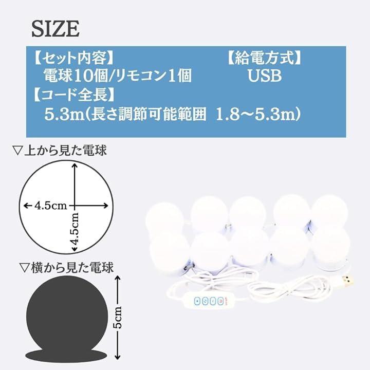 「商品内容」セット内容:電球x10個、リモコンx1個、固定用両面テープx1シート 給電方式:USB(タイプA) 電球サイズ(約):4.5cmx4.5cmx5cm、コード全長:3.3m (長さ調節可能範囲:1.5m-3.3m) 主な材質:PC、ABS *サイズ詳細は商品画像をご確認ください。